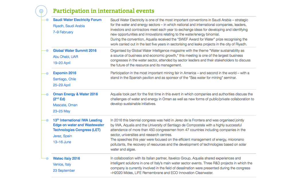In 2016, Aqualia notably increased its presence in strategic events and forums, both nationally and internationally, that consolidate the company’s positioning as a leader in the sector in the developing of innovative solutions that respond to current and future challenges in water management.