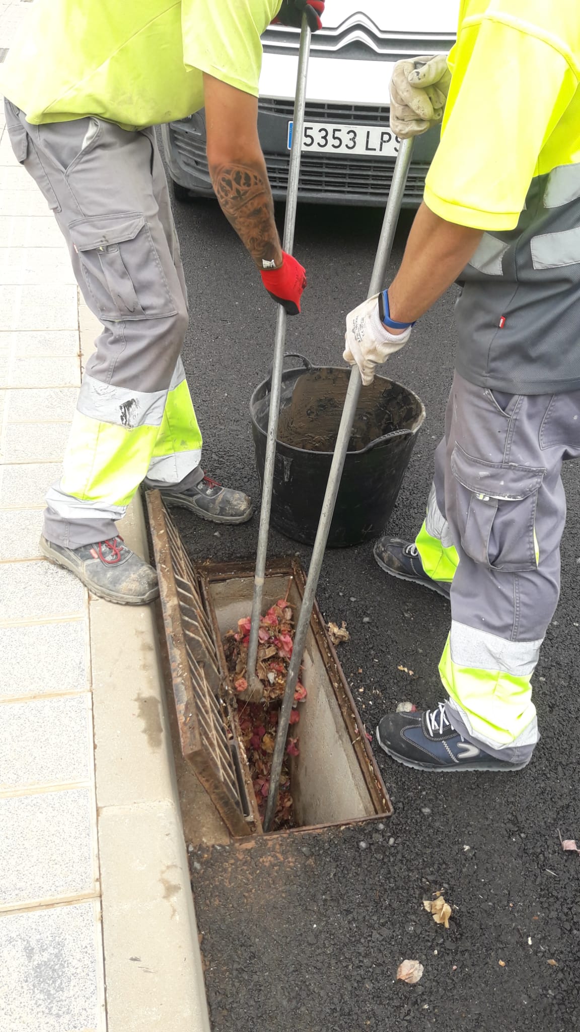 En el caso de las rejillas de los imbornales, la limpieza se realiza de manera manual. Los trabajadores acuden con un vehículo en el que van depositando todos los residuos extraídos, que después irán a parar a un vertedero. Finalmente insertan agua a presión dentro del imbornal para comprobar que el atasco ha desaparecido.