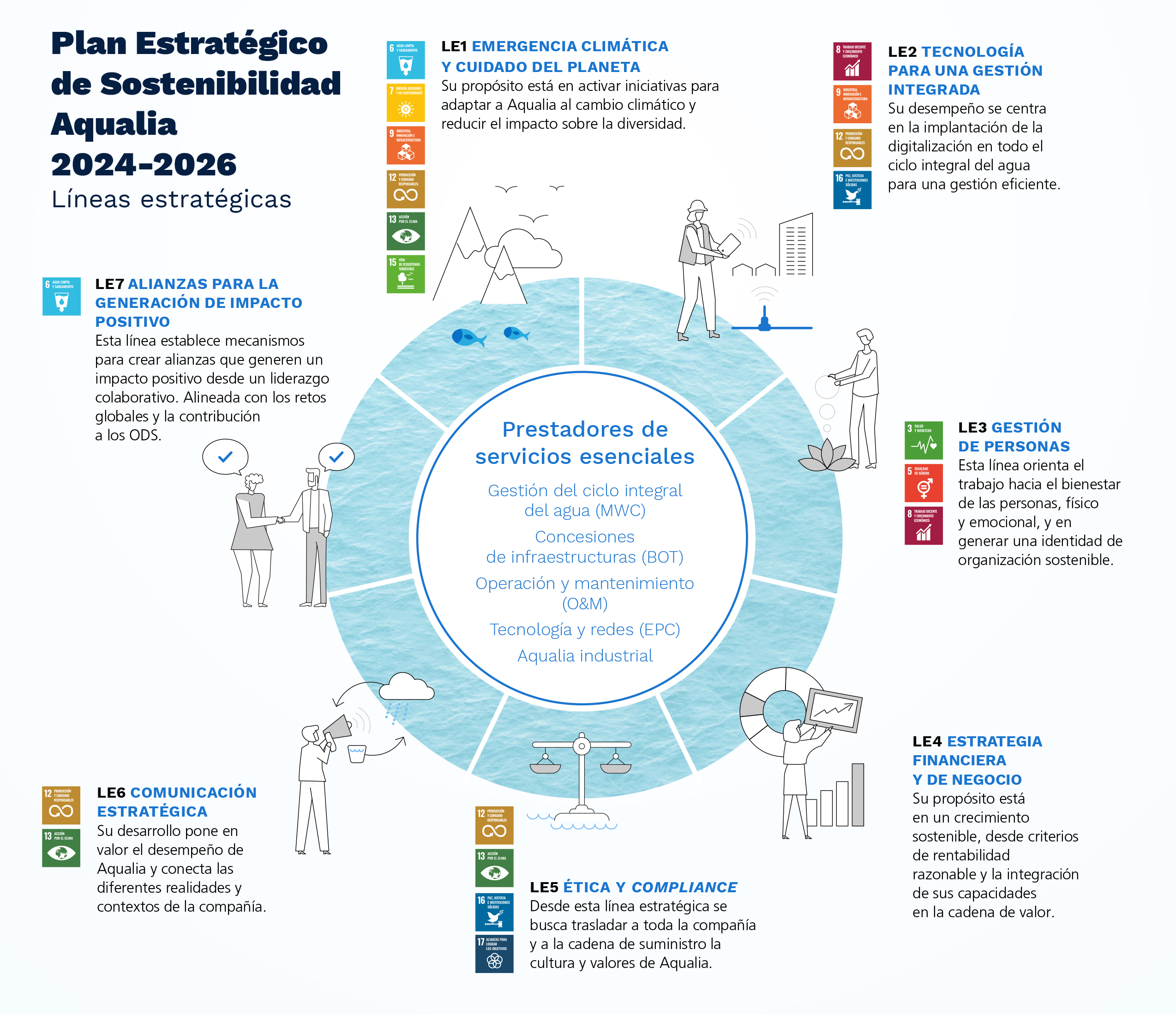 En el Plan Estratégico de Sostenibilidad de Aqualia 2024-2026, están materializados de nuevo y revisados, los compromisos firmes que Aqualia integra en su gestión diaria. Apostando por la sostenibilidad como camino para poder generar un modelo de prosperidad y bienestar que permita construir un planeta más justo, humano y perdurable.