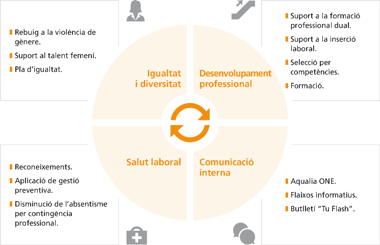 Aqualia ha desenvolupat quatre línies d'actuació principals a l'àrea de Recursos Humans: el desenvolupament professional, la comunicació interna, la salut laboral i la igualtat i diversitat.