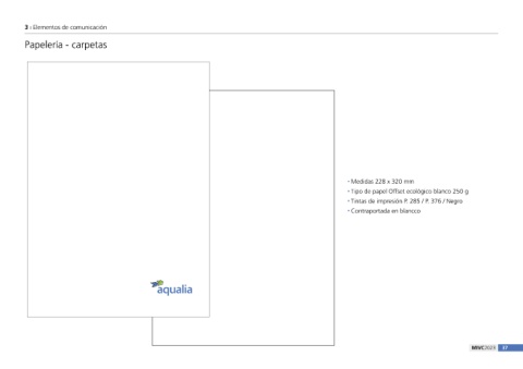 3 ı Elementos de comunicación Papelería - carpetas Medidas 228 x 320 mm Tipo de papel Offset ecológico blanco 250 g Tintas de impresión P. 285 / P. 376 / Negro Contraportada en blancco MIVC2023 37