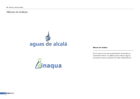 4 ı Marcas relacionadas Marcas sin endoso Marcas sin endoso En los casos en los que la participación de Aqualia es claramente inferior, no deberá usarse endoso alguno, actuando la marca resultante de modo independiente. 70 MIVC2023