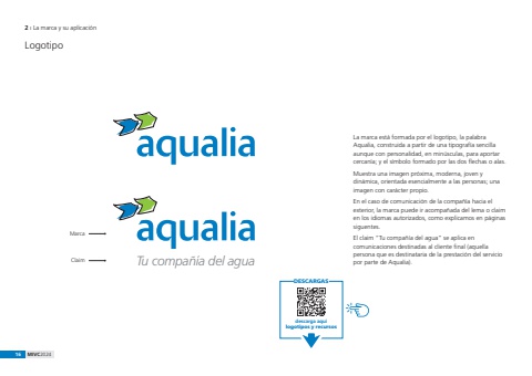 16 MIVC2024Logotipo2 %u0131 La marca y su aplicaci%u00f3nLa marca est%u00e1 formada por el logotipo, la palabra Aqualia, construida a partir de una tipograf%u00eda sencilla aunque con personalidad, en min%u00fasculas, para aportar cercan%u00eda; y el s%u00edmbolo formado por las dos flechas o alas. Muestra una imagen pr%u00f3xima, moderna, joven y din%u00e1mica, orientada esencialmente a las personas; una imagen con car%u00e1cter propio.En el caso de comunicaci%u00f3n de la compa%u00f1%u00eda hacia el exterior, la marca puede ir acompa%u00f1ada del lema o claim en los idiomas autorizados, como explicamos en p%u00e1ginas siguentes. El claim %u201cTu compa%u00f1%u00eda del agua%u201d se aplica en comunicaciones destinadas al cliente final (aquella persona que es destinataria de la prestaci%u00f3n del servicio Tu compa%u00f1%u00eda del agua por parte de Aqualia).MarcaClaimDESCARGASdescarga aqu%u00edlogotipos y recursos