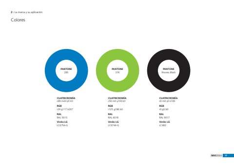 MIVC2024 17ColoresCUATRICROM%u00cdAc89 m43 y0 k0RGBr26 g117 b207RALRAL 5015Vinilo LGLC6756-GPANTONE 285CUATRICROM%u00cdAc50 m0 y100 k0RGBr125 g186 b0RALRAL 6018Vinilo LGLC6744-GPANTONE 376CUATRICROM%u00cdAc0 m0 y0 k100RGBr0 g0 b0RALRAL 9017Vinilo LGLC682PANTONE Process Black2 %u0131 La marca y su aplicaci%u00f3n