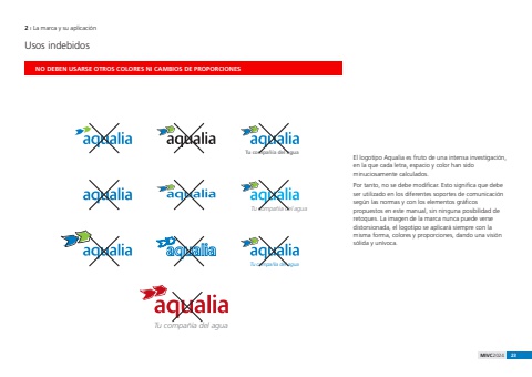 MIVC2024 232 %u0131 La marca y su aplicaci%u00f3nTu compa%u00f1%u00eda del aguaTu compa%u00f1%u00eda del aguaTu compa%u00f1%u00eda del aguaTu compa%u00f1%u00eda del aguaNO DEBEN USARSE OTROS COLORES NI CAMBIOS DE PROPORCIONESUsos indebidosEl logotipo Aqualia es fruto de una intensa investigaci%u00f3n, en la que cada letra, espacio y color han sido minuciosamente calculados.Por tanto, no se debe modificar. Esto significa que debe ser utilizado en los diferentes soportes de comunicaci%u00f3n seg%u00fan las normas y con los elementos gr%u00e1ficos propuestos en este manual, sin ninguna posibilidad de retoques. La imagen de la marca nunca puede verse distorsionada, el logotipo se aplicar%u00e1 siempre con la misma forma, colores y proporciones, dando una visi%u00f3n s%u00f3lida y un%u00edvoca.