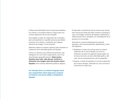 El Manual de Identidad Visual Corporativa establece los criterios y normativas b%u00e1sicas a seguir para una correcta aplicaci%u00f3n de la marca Aqualia.Est%u00e1 dirigido a todos los integrantes de la empresa, pero principalmente a aquellas personas que deban intervenir en el dise%u00f1o y realizaci%u00f3n de cualquier elemento de imagen o comunicaci%u00f3n.Debemos realizar el m%u00e1ximo esfuerzo para mantener la coherencia de la identidad gr%u00e1fica de Aqualia.Somos un colectivo muy extenso de personas, que trabajamos en una misma organizaci%u00f3n, pero muy diversificados geogr%u00e1ficamente. Todos juntos tenemos que velar cada d%u00eda por construir y alimentar una imagen %u00fanica de nuestra marca Aqualia entre nuestros diferentes p%u00fablicos objetivo.Un mensaje claro y un mismo lenguaje visual que compartimos entre todos para construir y mantener una marca s%u00f3lida y competitiva: Aqualia.El adecuado cumplimiento de las normas que incluye este manual por parte de todos nosotros contribuye a crear una imagen uniforme de Aqualia, facilitando la diferenciaci%u00f3n de la compa%u00f1%u00eda y la consolidaci%u00f3n de su posici%u00f3n en el mercado.Teniendo en cuenta el planteamiento general expuesto, este manual pretende, b%u00e1sicamente, cubrir dos objetivos:%u00b4 Establecer e ilustrar las normas para la correcta utilizaci%u00f3n de la marca Aqualia, as%u00ed como la utilizaci%u00f3n de todos los aspectos relacionados con la marca (correcto uso de la identidad gr%u00e1fica, del color, de los emplazamientos y de la tipograf%u00eda).%u00b4 Explicar, a trav%u00e9s de ejemplos, la correcta aplicaci%u00f3n de la marca Aqualia, indicando los usos correctos e incorrectos en cada caso.