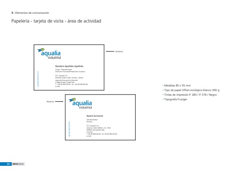 32 MIVC20243 %u0131 Elementos de comunicaci%u00f3n%u0082 Medidas 85 x 55 mm%u0082 Tipo de papel Offset ecol%u00f3gico blanco 300 g%u0082 Tintas de impresi%u00f3n P. 285 / P. 376 / Negro%u0082 Tipograf%u00eda Frutiger ReversoAnversoPapeler%u00eda - tarjeta de visita - %u00e1rea de actividadName SurnameJob descriptionDivisionFCC Aqualia S.A.Avenue, street address, no., floor00000 Local postal codeCountryT. 00 00 000 00 00 - M. 00 00 000 00 00 aqualiaindustrial.come-mailNombre Apellido ApellidoCargo - DepartamentoDireccion Funcional/Producci%u00f3n (si aplica)FCC Aqualia S.A.Nombre Avda o calle, n%u00famero - plantasegunda l%u00ednea para la direcci%u00f3nC%u00f3digo Postal Ciudad Pa%u00edsT. +34 00 000 00 00 - M. +34 00 000 00 00 aqualiaindustrial.come-mail