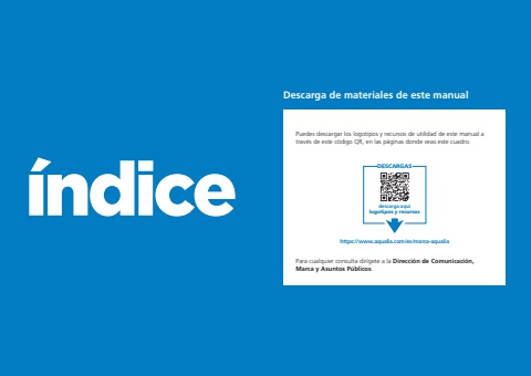 %u00edndiceDescarga de materiales de este manualPuedes descargar los logotipos y recursos de utilidad de este manual a trav%u00e9s de este c%u00f3digo QR, en las p%u00e1ginas donde veas este cuadro.Para cualquier consulta dir%u00edgete a la Direcci%u00f3n de Comunicaci%u00f3n, Marca y Asuntos P%u00fablicos.https://www.aqualia.com/es/marca-aqualiaDESCARGASdescarga aqu%u00edlogotipos y recursos