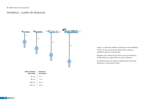 40 MIVC2024Se%u00f1al%u00e9tica - cuadro de distanciasSeg%u00fan su ubicaci%u00f3n podemos distinguir entre se%u00f1al%u00e9tica interior, la que se encuentra dentro de la oficina y se%u00f1al%u00e9tica exterior, fuera de ella.Respecto de la distancia de lectura, de corta distancia, media distancia, larga distancia y gran distancia.Se presenta aqu%u00ed una relaci%u00f3n aproximada entre estas distancias y la altura del r%u00f3tulo.3 %u0131 Elementos de comunicaci%u00f3n6 m15 m35 m55 m30 m 80 m 200 m 330 mAltura m%u00ednimadel r%u00f3tulo30 mm80 mm200 mm330 mmDistanciade lectura6 m15 m35 m55 m