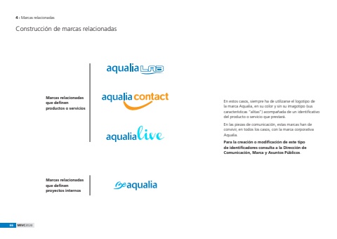 66 MIVC2024Construcci%u00f3n de marcas relacionadas4 %u0131 Marcas relacionadasEn estos casos, siempre ha de utilizarse el logotipo de la marca Aqualia, en su color y sin su imagotipo (sus caracter%u00edsticas %u201calitas%u201d) acompa%u00f1ada de un identificativo del producto o servicio que prestar%u00e1.En las piezas de comunicaci%u00f3n, estas marcas han de convivir, en todos los casos, con la marca corporativa Aqualia.Para la creaci%u00f3n o modificaci%u00f3n de este tipo de identificadores consulta a la Direcci%u00f3n de Comunicaci%u00f3n, Marca y Asuntos P%u00fablicos.Marcas relacionadas que definen proyectos internosMarcas relacionadas que definen productos o servicios