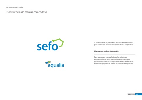 MIVC2024 67Convivencia de marcas con endoso4 %u0131 Marcas relacionadasA continuaci%u00f3n se presenta la relaci%u00f3n de convivencia para las marcas relacionadas con la marca corporativa.Marcas con endoso de AqualiaPara las nuevas marcas fruto de las relaciones empresariales en las que Aqualia tiene una mayor participaci%u00f3n, la marca corporativa deber%u00e1 aparecer en forma de apoyo en las piezas en las que sea oportuno.