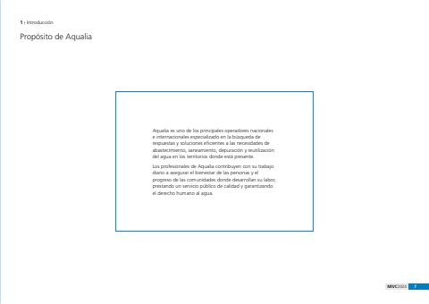 MIVC2024 71 %u0131 Introducci%u00f3nProp%u00f3sito de AqualiaAqualia es uno de los principales operadores nacionales e internacionales especializado en la b%u00fasqueda de respuestas y soluciones eficientes a las necesidades de abastecimiento, saneamiento, depuraci%u00f3n y reutilizaci%u00f3n del agua en los territorios donde est%u00e1 presente. Los profesionales de Aqualia contribuyen con su trabajo diario a asegurar el bienestar de las personas y el progreso de las comunidades donde desarrollan su labor, prestando un servicio p%u00fablico de calidad y garantizando el derecho humano al agua.