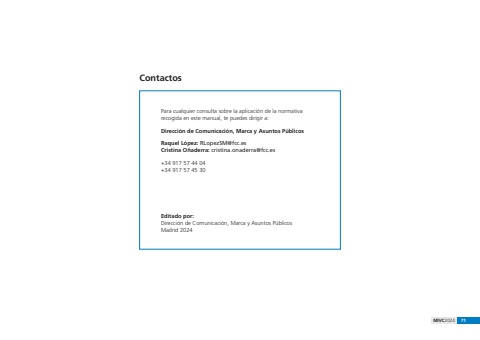 MIVC2024 71Editado por:Direcci%u00f3n de Comunicaci%u00f3n, Marca y Asuntos P%u00fablicosMadrid 2024Para cualquier consulta sobre la aplicaci%u00f3n de la normativa recogida en este manual, te puedes dirigir a:Direcci%u00f3n de Comunicaci%u00f3n, Marca y Asuntos P%u00fablicosRaquel L%u00f3pez: RLopezSM@fcc.esCristina O%u00f1aderra: cristina.onaderra@fcc.es+34 917 57 44 04+34 917 57 45 30Contactos