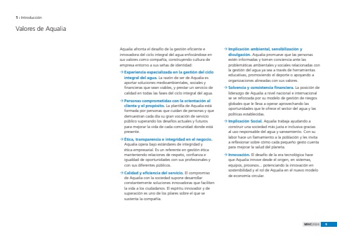 MIVC2024 91 %u0131 Introducci%u00f3nValores de AqualiaAqualia afronta el desaf%u00edo de la gesti%u00f3n eficiente e innovadora del ciclo integral del agua enfoc%u00e1ndose en sus valores como compa%u00f1%u00eda, construyendo cultura de empresa entorno a sus se%u00f1as de identidad:%u00b4 Experiencia especializada en la gesti%u00f3n del ciclo integral del agua. La raz%u00f3n de ser de Aqualia es aportar soluciones medioambientales, sociales y financieras que sean viables, y prestar un servicio de calidad en todas las fases del ciclo integral del agua.%u00b4 Personas comprometidas con la orientaci%u00f3n al cliente y el prop%u00f3sito. La plantilla de Aqualia est%u00e1 formada por personas que cuidan de personas y que demuestran cada d%u00eda su gran vocaci%u00f3n de servicio p%u00fablico superando los desaf%u00edos actuales y futuros para mejorar la vida de cada comunidad donde est%u00e1 presente.%u00b4 %u00c9tica, transparencia e integridad en el negocio.Aqualia opera bajo est%u00e1ndares de integridad y %u00e9tica empresarial. Es un referente en gesti%u00f3n %u00e9tica manteniendo relaciones de respeto, confianza e igualdad de oportunidades con sus profesionales y con sus diferentes p%u00fablicos. %u00b4 Calidad y eficiencia del servicio. El compromiso de Aqualia con la sociedad supone desarrollar constantemente soluciones innovadoras que faciliten la vida a los ciudadanos. El esp%u00edritu innovador y de superaci%u00f3n es uno de los pilares sobre el que se sustenta la compa%u00f1%u00eda. %u00b4 Implicaci%u00f3n ambiental, sensibilizaci%u00f3n y divulgaci%u00f3n. Aqualia promueve que las personas est%u00e9n informadas y tomen conciencia ante las problem%u00e1ticas ambientales y sociales relacionadas con la gesti%u00f3n del agua ya sea a trav%u00e9s de herramientas educativas, promoviendo el deporte o apoyando a organizaciones alineadas con sus valores.%u00b4 Solvencia y consistencia financiera. La posici%u00f3n de liderazgo de Aqualia a nivel nacional e internacional se ve reforzada por su modelo de gesti%u00f3n de riesgos globales que le lleva a operar aprovechando las oportunidades que le ofrece el sector del agua y las pol%u00edticas establecidas.%u00b4 Implicaci%u00f3n Social. Aqualia trabaja ayudando a construir una sociedad m%u00e1s justa e inclusiva gracias al uso responsable del agua y saneamiento. Con su labor hace un llamamiento a la poblaci%u00f3n y les invita a reflexionar sobre c%u00f3mo cada peque%u00f1o gesto cuenta para mejorar la salud del planeta.%u00b4 Innovaci%u00f3n. El desaf%u00edo de la era tecnol%u00f3gica hace que Aqualia innove desde el origen, en sistemas, equipos, procesos... potenciando la innovaci%u00f3n en sostenibilidad y el rol de Aqualia en el nuevo modelo de econom%u00eda circular.