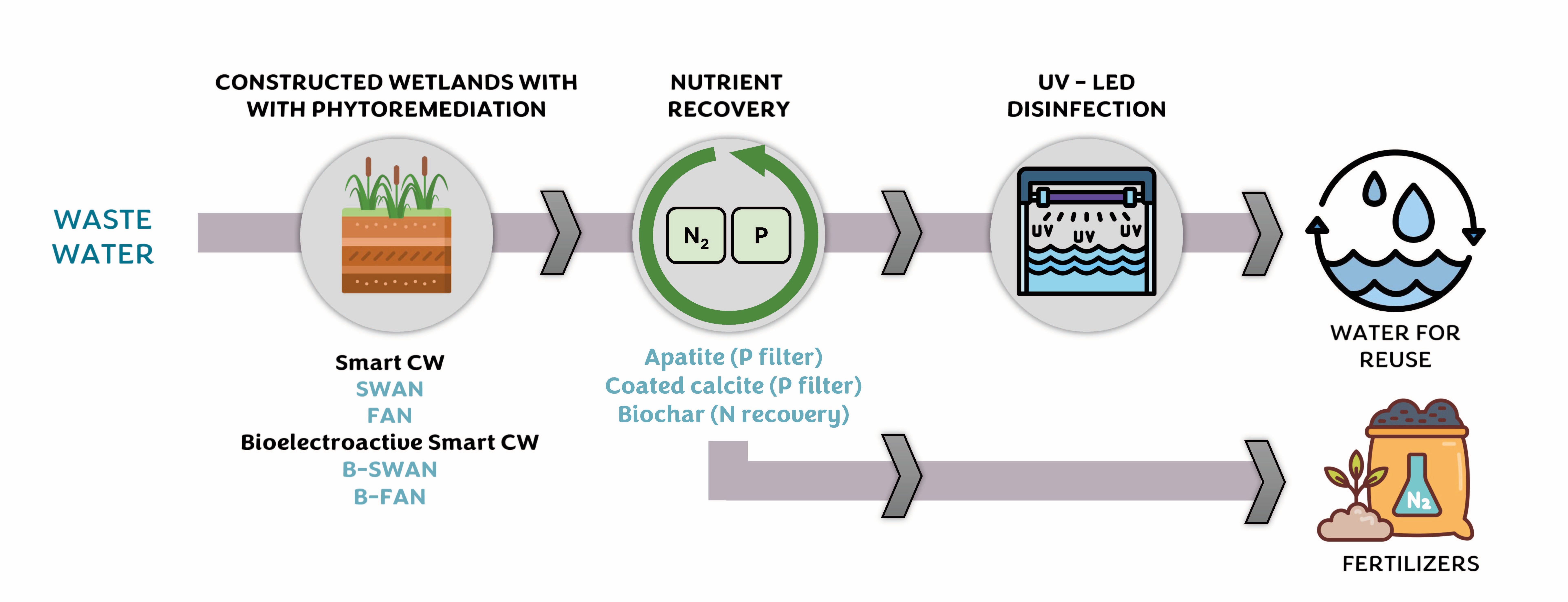 The core of smallWAT consists of developing and validating a system that integrates advanced constructed wetlands, filtration columns for nitrogen and phosphorus recovery, and UVC‑LED disinfection technologies.