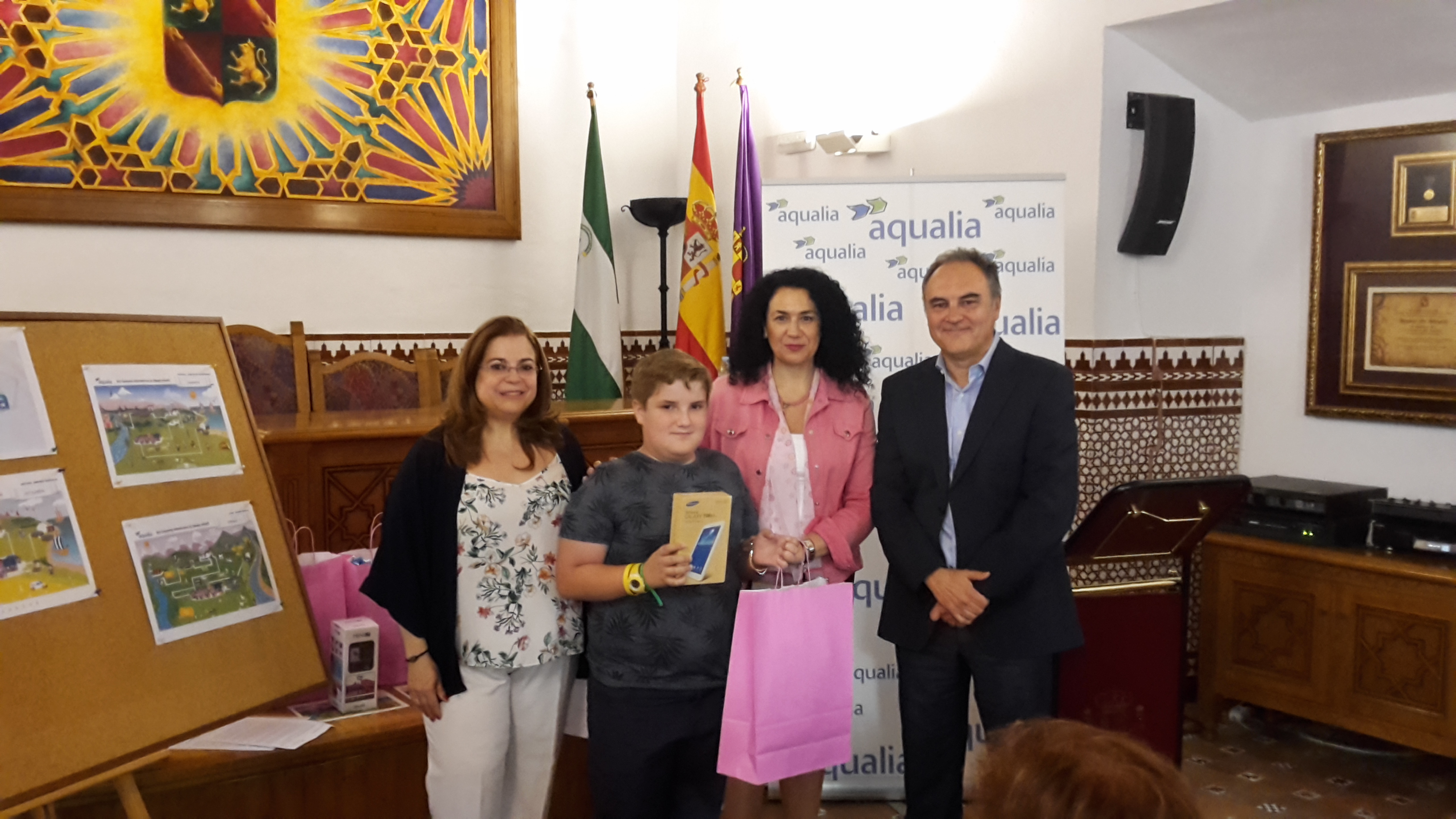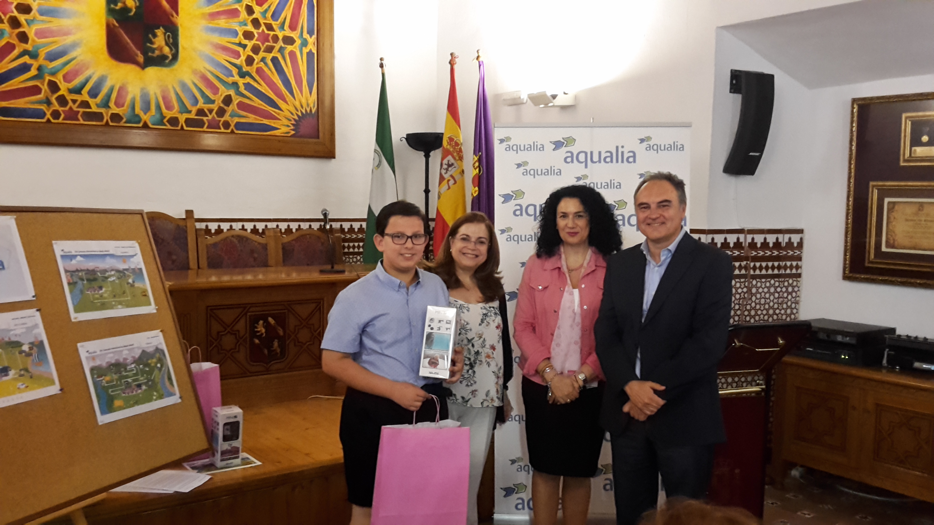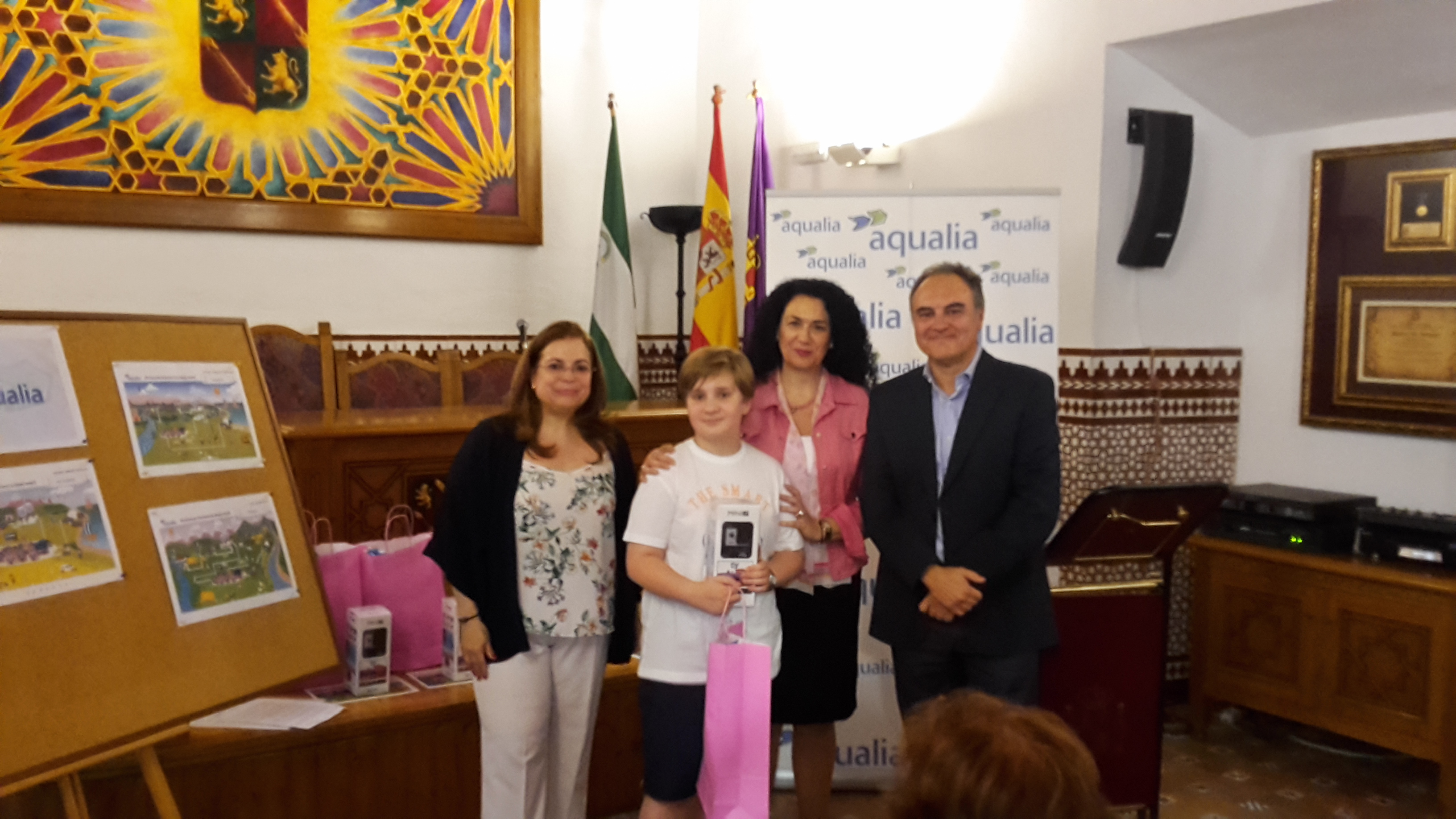 Cinco jóvenes alumnos de Jaén han recibido un premio de manos de la concejala de Educación, Mª Isabel Azañón, el Gerente de Aqualia en la ciudad, Juan Carlos Piñar, y  la jefa de Gestión de Clientes, Anabel Ruiz, por sus trabajos presentados en el XIV Concurso Internacional de Dibujo Infantil, certamen que anualmente convoca Aqualia con motivo del Día Mundial del Agua, y en el que en esta edición, bajo el título “El ciclo del agua para valientes”, han participado miles de alumnos de 3º y 4º de Primaria de los colegios de España y Portugal en los que Aqualia presta servicio.