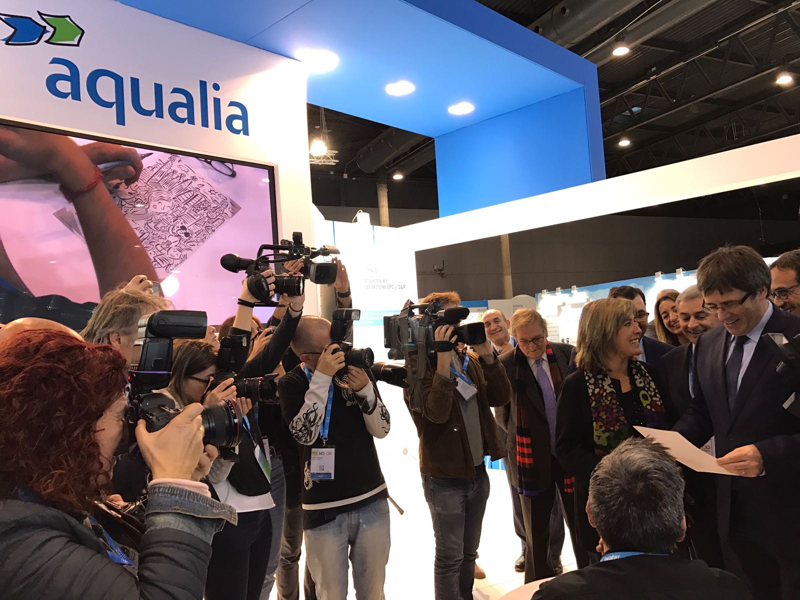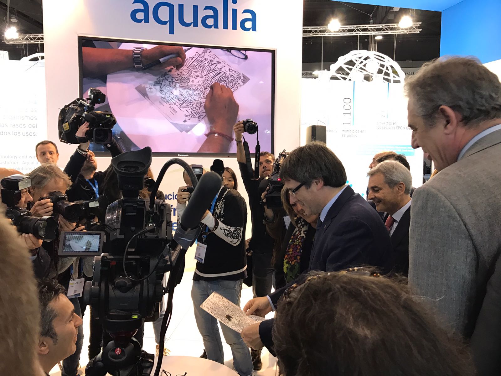 Uno de los momentos más simpáticos del recorrido ha tenido lugar en el stand de Aqualia. Allí, Félix Parra, director general de Aqualia ha recibido a la comitiva y les ha explicado el papel que Aqualia desarrolla en la gestión de los servicios públicos ligados al ciclo integral del agua. Durante su visita, el presidente de la Generalitat ha tenido tiempo de posar para el ilustrador con el que Aqualia cuenta en su stand. Finalmente Puigdemont ha sido obsequiado con el retrato, que se ha llevado de recuerdo.