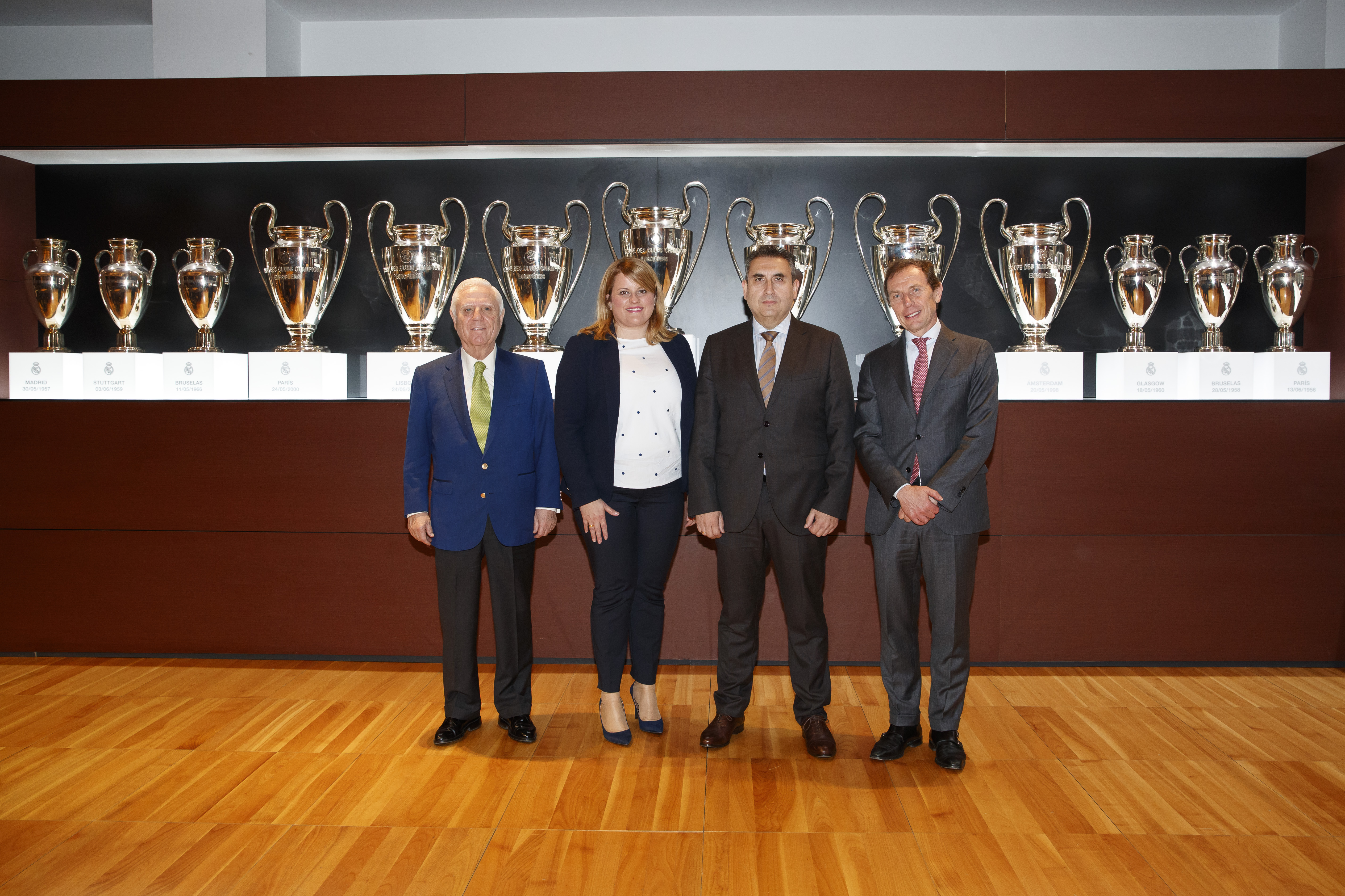 Emilio Butragueño, director de Relaciones Institucionales del Real Madrid, Alicia Jiménez, alcaldesa de Mazarrón, e Higinio Martínez, director de la Delegación Levante de Aqualia han rubricado el acuerdo en el estadio Santiago Bernabeu